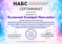 С начала 2024 года я занимаюсь консультированием моих клиентов в направлении изменения их поведения на более эффективное, избавлением от страхов продаж, переговоров и публичных презентаций своих услуг, а также избавлением от неуверенности, сомнений и чувства стыда в различных проявлениях. Все это нужно моим клиентам для того, чтобы они начинали чувствовать себя свободно, уверенно и спокойно в процессе продажи своих услуг, на переговорах, в работе с рекламациями и просто при общении с клиентами.